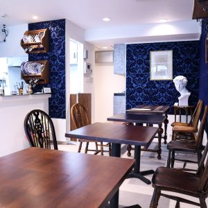 店内に入って一番最初に目を奪われるのが、ロイヤルブルーの壁紙。