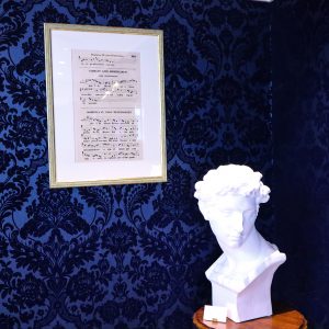 壁に飾られた讃美歌の楽譜と石膏像。